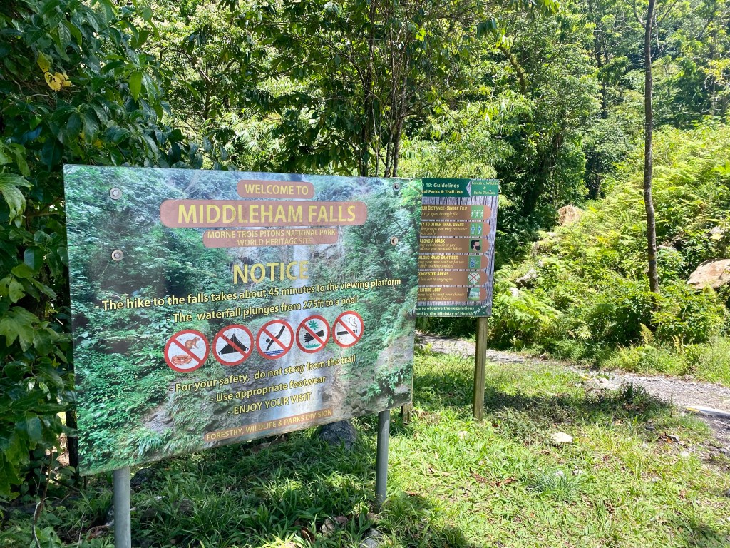 The first section of the trail to Middleham Falls is on the Waitukubuli National Trail, the Caribbean’s first long distance hiking trail. You can see that you are on the trail by the painted markers of blue and yellow.