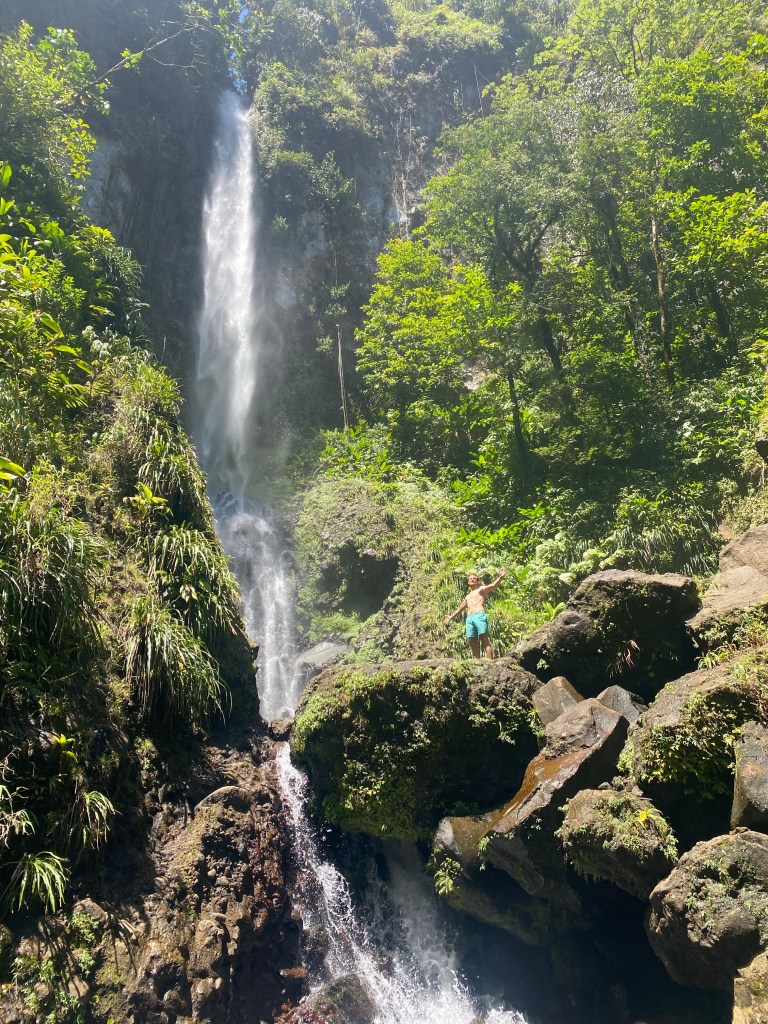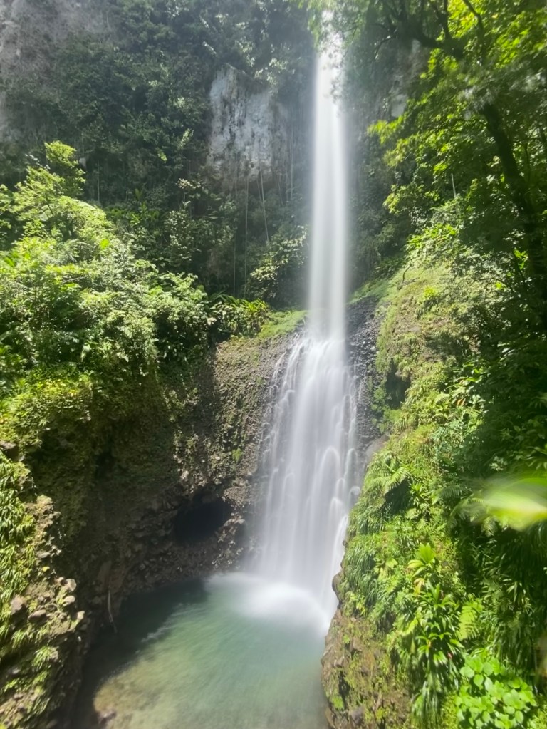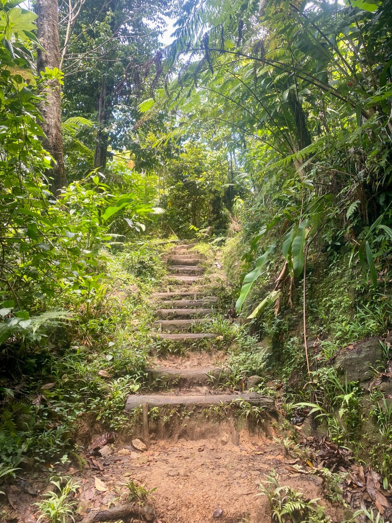 After a mostly uphill climb you’ll come to an intersection with another trail. The Waitukubuli Trail heads to the right and the trail to Middleham Falls drops downhill to the left. This is where the trail becomes even more technically challenging. Luckily, it’s a short hike downhill.
