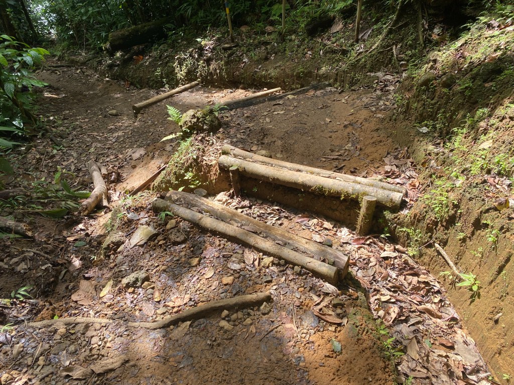 As you hike along, listen for the calls of birds in the jungle. Take note of the massive trees and colorful flowers. Also notice the drainage that has been engineered into the trail – it’s quite impressive.
