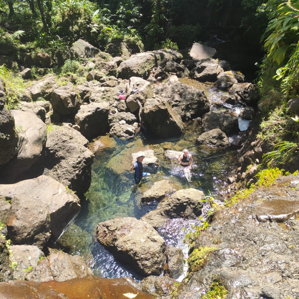 Once you get to the bottom of the canyon you can decide where to go. We climbed our way to the pool at the base of the falls but it was so windy and such a torrent that it wasn’t pleasant at all. So we headed back to a pool a little further downstream and enjoyed a soak, with the fishes. Our muscles were grateful for the cold water! At this point we noted that almost everyone we had seen on the trail (maybe a dozen or so people) was our kids’ ages.