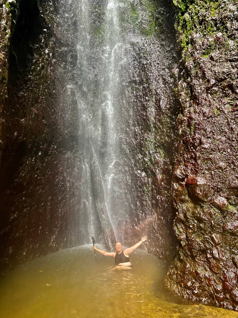 Along with the waterfall, water seeps out of the rocks alongside. It’s as if Mother Earth is determined to get you wet! This is the moment when I decided that, because I had my bikini on under my clothes, I didn’t care that I’m an overweight pale old lady and stripped down to get into the water.