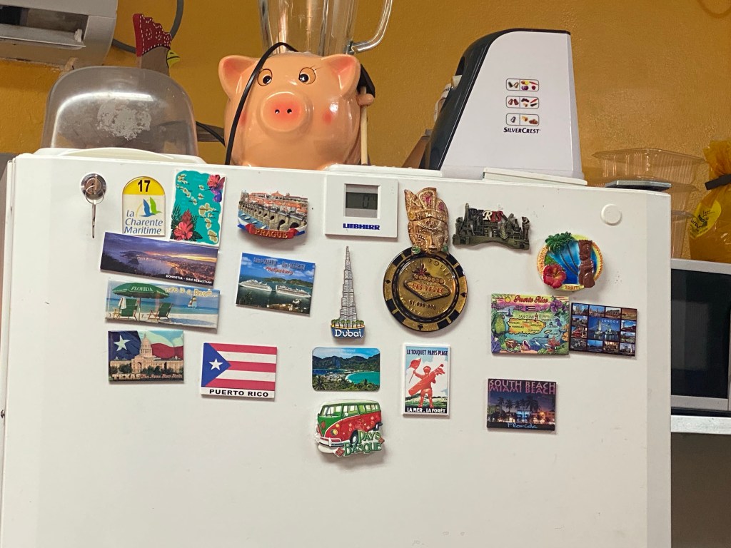 I’m in Les Saintes in Guadeloupe and stopped in a French deli, Robbe Steack, to get a few things. I noticed that the proprietor had refrigerator magnets on her well-traveled fridge.